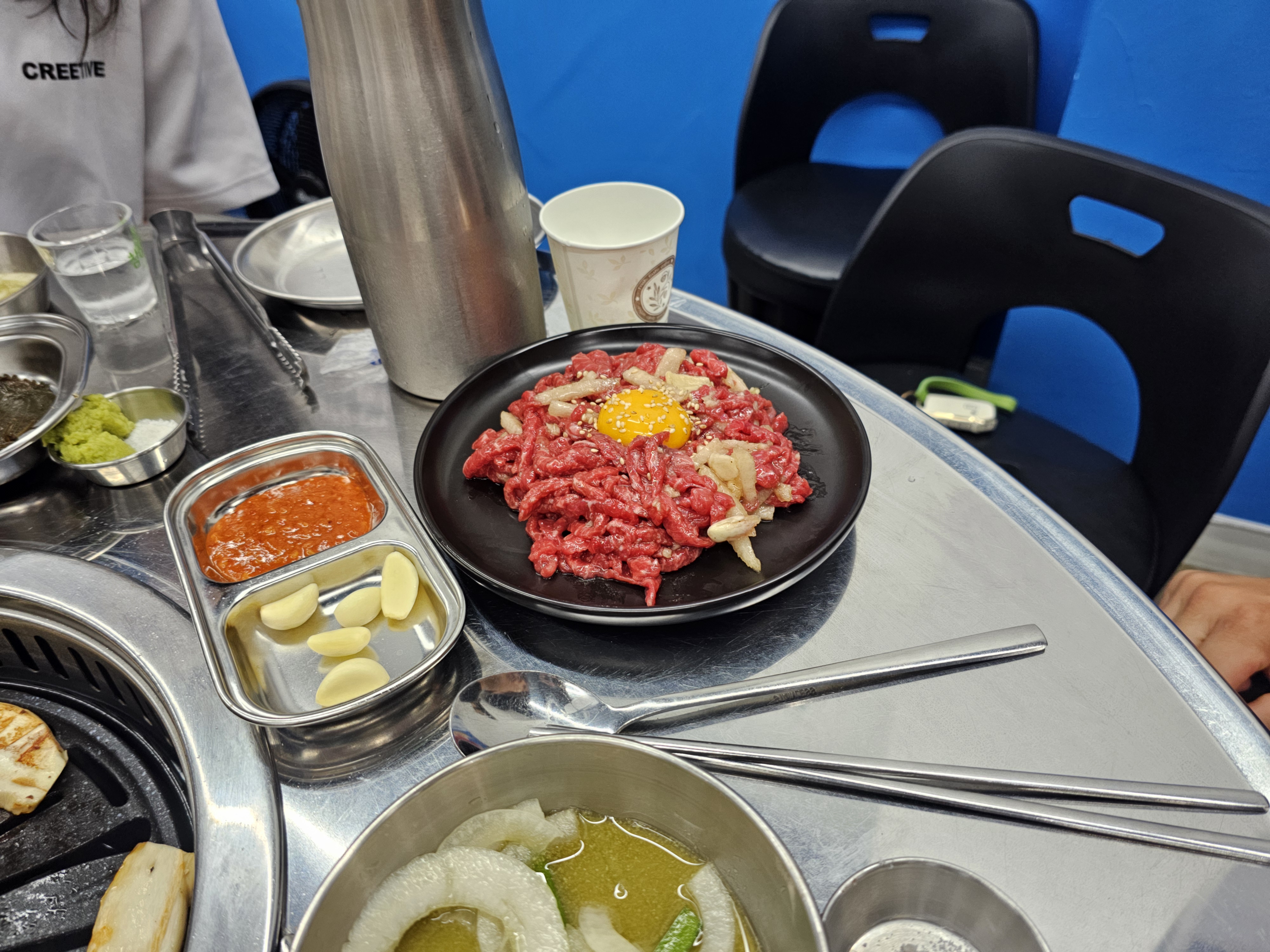 그리고 계란찜, 육회, 마지막엔 비냉,물냉 이렇게 시켰습니다. 인원은 총 4명이였어요 ㅎㅎ