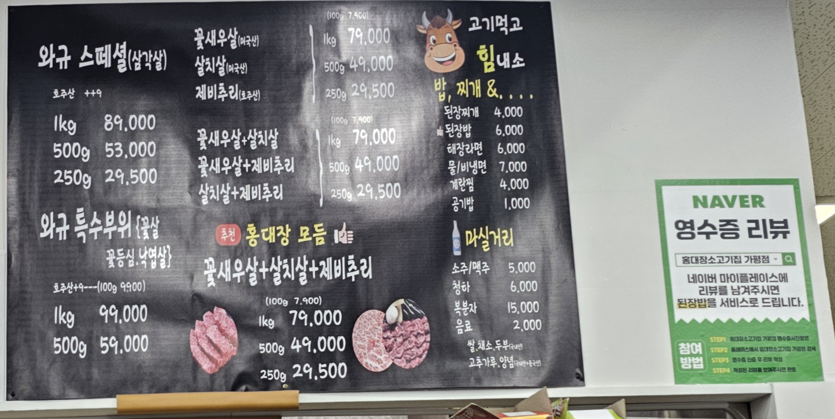 메뉴판에서 저는 살치살을 좋아해서 살치살이 있는 1kg 모듬을 시켰어요~